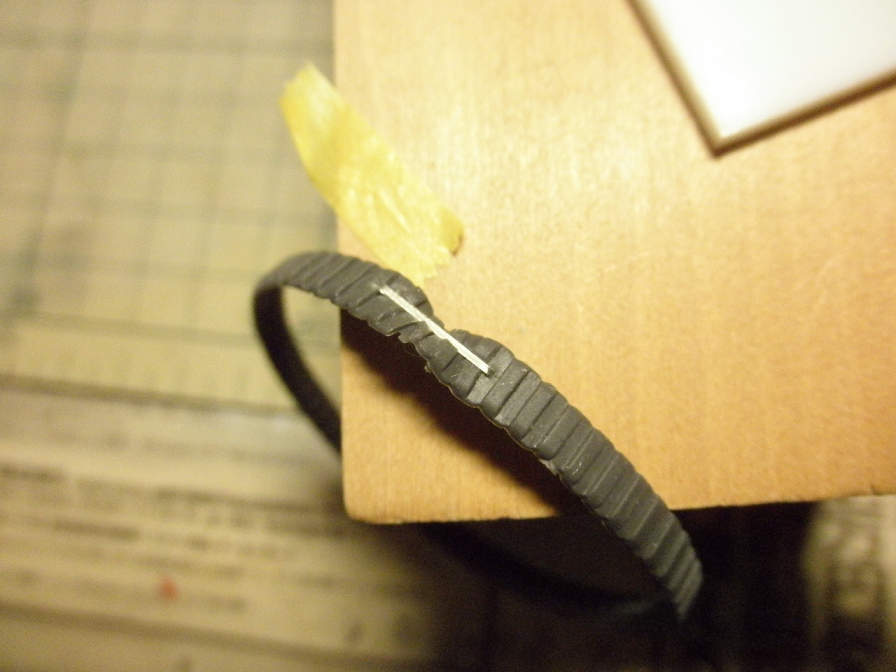 キットのキャタピラは、古式ゆかしい、焼き止めするベルト式です。このキットのキャタピラは、材質はゴムみたいです。なので、素直に焼き止め(ヒートペン使用)をしたのですが、しかしこれが極めてやりにくかったりします。プルプルしてる素材な割に反発力??が強いのでテープで固定しようとしたのですが、テープの糊がほとんど効かないので固定が出来ないし、ヒートペンとの相性が悪かったのか、上手く焼き止めできませんでした。なので、短気起こして??仮止め程度に焼き止めしたところに、ホチキスで強引に固定してしまいました。
