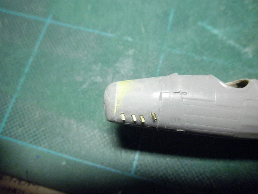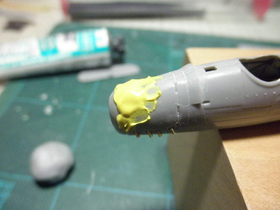 このキット、ファインモールドの設計とは言っても、開発は古いので、合いはあまり良くありません。あちこちに隙間や段差が生じますが、カウル部分も、そのままではピッタリ合いません。機首のラインを絞り込み過ぎと言うか、上部のラインが下方に落ち込みすぎな感じなので、カウルの接着は、下側を合わせて取り付けます。すると先の写真のように段差が出来るので、ここにポリパテを盛り付けます↓↓↓。