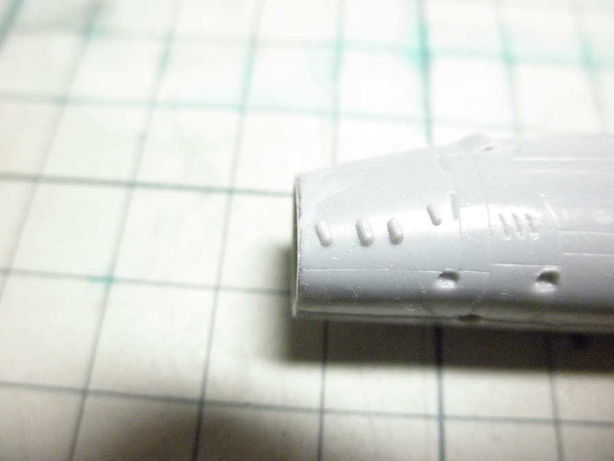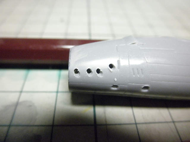 エンジンを作らない事にしましたが、そこに掛けるはずだったぶんの手間を、排気筒のディティールアップにかけることにします。という事で、キットの排気筒モールドをバッサリと切り落とし、取り付け用の穴を開けます。