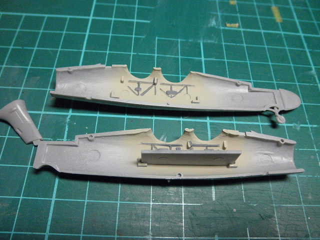 まだ接着していませんが、この段階で、車体上部(パーツF29)の合わせを調節しておきます。この調整自体は大した事ではありませんが、後部の合わせで看過できない大きな隙間が発生します。これは、F29に0.25mmプラ板を貼りつける事によって処置します。