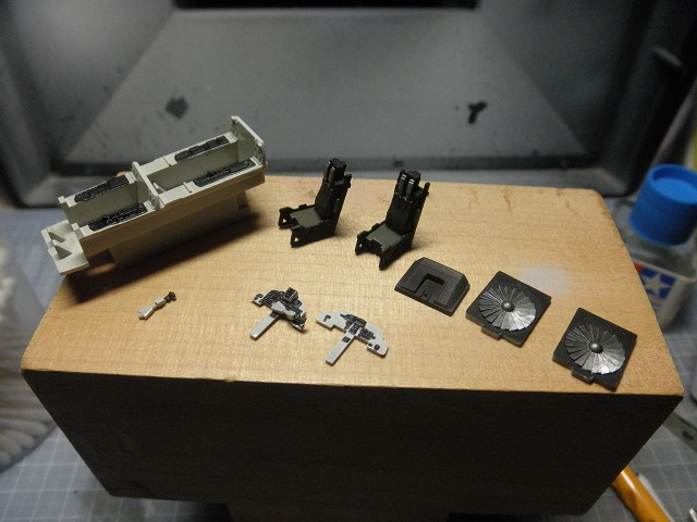 コクピットの続き。前回までに組めるところを組んだので、塗装を済ませてしまいましょう。ここは組説の指定どおりに塗っていきます。と同時に、インテイク最奥部のタービンブレードのパーツも塗装してしまいましょう。