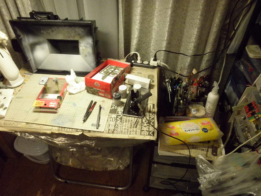 判りづらいと思いますが、上の写真の一番左に移っている四角いのが私の使っている、タミヤの”ペインティングブース”です。現在は改良型の”Ⅱ”の登場により絶版になったモデル。とあるお店で、殆ど投売り状態価格で売ってたのを買ったものです。エアブラシ塗装と言うのは、霧状の塗料を飛ばして塗装を行うものなので、ちゃんとした換気設備がないと、霧状の塗料(ミスト)が部屋の中を漂うことになります。それを吸い込むのは体によくないし、埃としてあちこちに積もることにもなります。