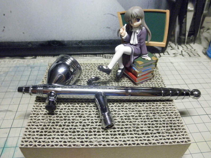 これが、私が塗装時にメインに使っているエアブラシ(正確にはハンドピースと言います)。ウェーブの”スーパーエアブラシ・アドバンス02”と言うモデルです。いわゆるダブルアクションと言うタイプで、トリガーの引き具合で塗料の吹きだし具合をコントロール出来るものです。それ以外に、エアの吐出量が調節できるバルブも備わっているため、表現の幅がかなり広くなっています。これ以外にも、メタリック塗料&下地剤吹き用に、同じウェーブの”EZ500”と言うモデル(こちらはシングルアクション)も使用しています。