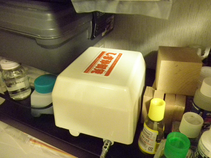 ワークの”しずか御免”と言うモデルです。これは、模型用(に限らないか)のコンプレッサーとしては、名前のとおり、最も動作音が静かな物です。冷蔵庫以上に静かな動作音で、夜間に使っても、家の中はおろか、ご近所にも迷惑をかけないと言う。まあ、その代わり、エアの圧力も模型用(に限らず)としては最も弱いものだったりするんですが(そのため、ハンドピースは、口径0.3mmのものまでしか使えません)。と言っても、その最弱のエアで困ったことは今までありませんが。