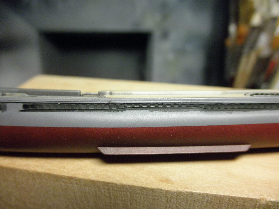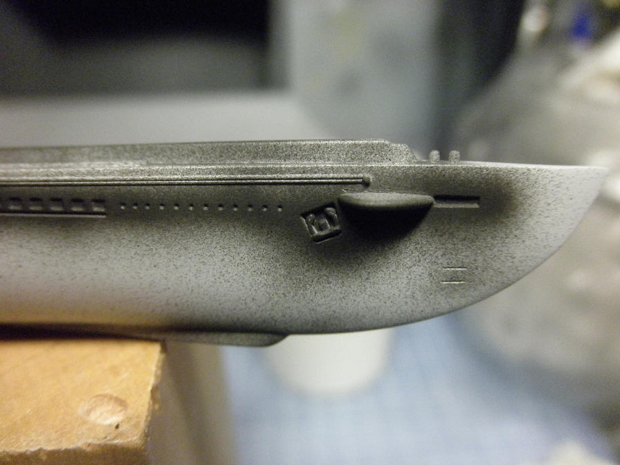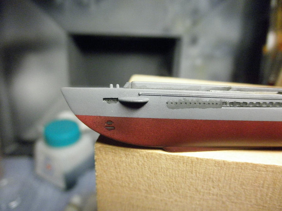 赤い部分の上限(赤と本体のグレイとの境目)は、本来は後部のスクリューガードよりも下になるのですが、境目付近で変に色が透けることの無い様、船体側面のほぼ全面にしっかりと吹きつけておきます(後で書きますが、今回はちょっと失敗でしたが)。
