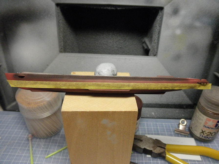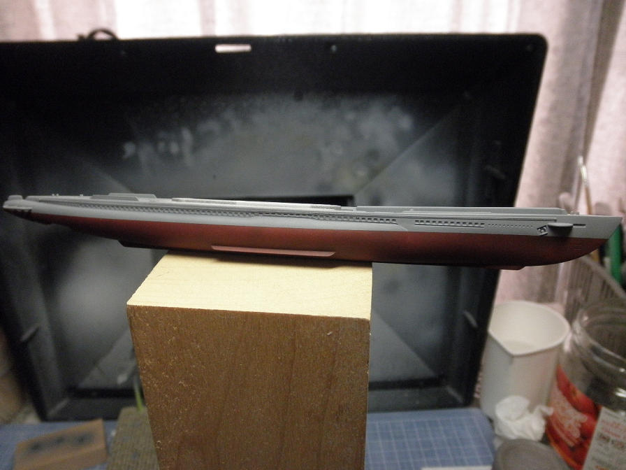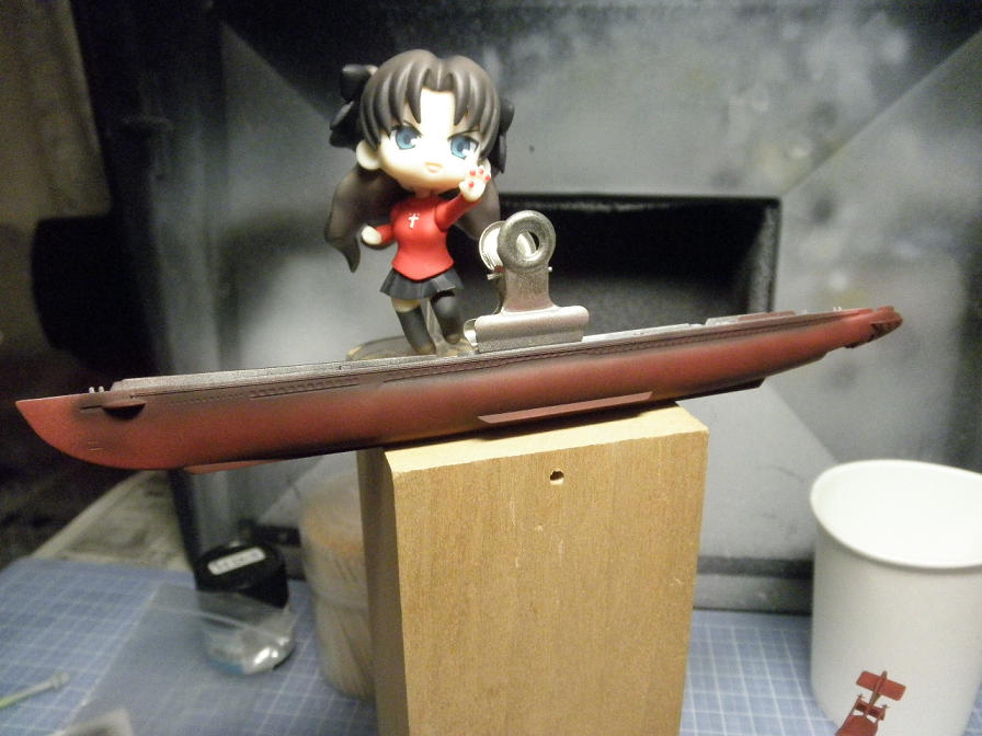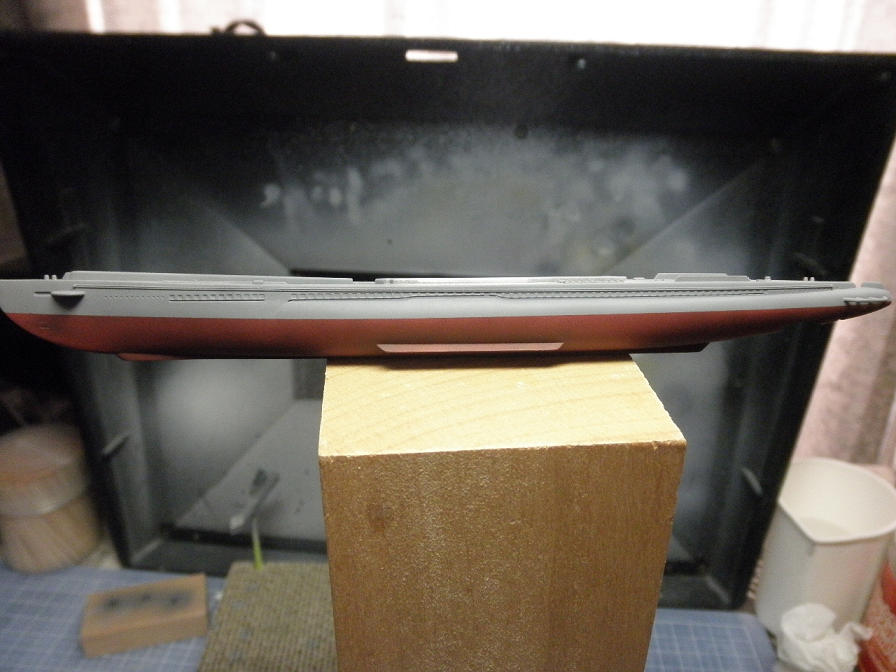 ハルレッドが乾いたら、次は本体のグレイです。まあ、当然ですが、グレイの吹きつけは、先に塗ったハルレッド部分に塗料が付かないようにしなければなりません。