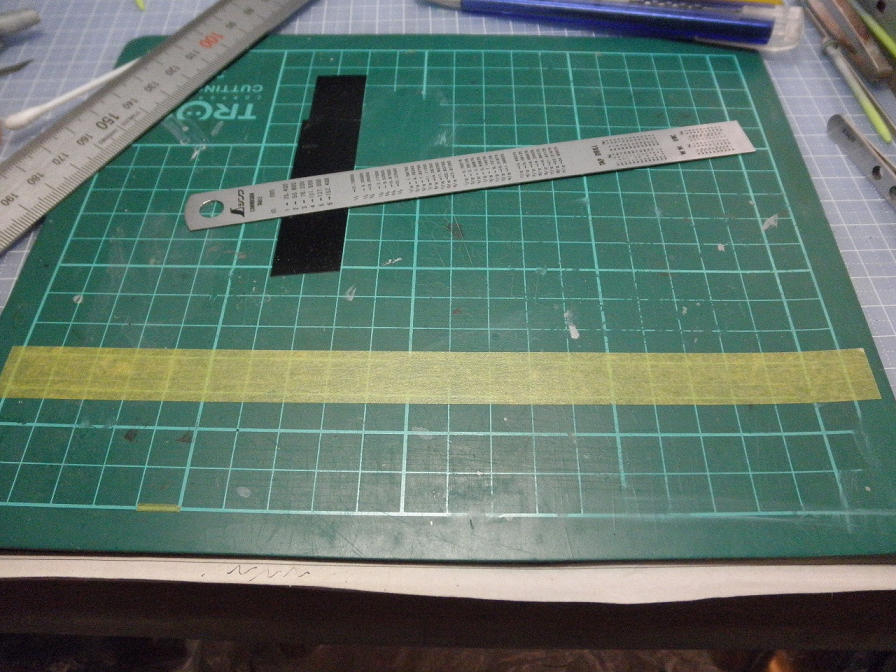 そこで、マスキングをするのですが、マスキングテープ(私はタミヤのものを使用)は、テープの縁は避けて使うようにして下さい。タミヤのものはケースに入っているのですが、普通、マスキングテープと言うのは、テープの縁が外部に露出しています。それをそのまま使うと、縁についた埃などのゴミを塗面に巻き込むことになるのと、塗り分け部分がシャープに仕上がらなくなる危険性があります。上の写真のように、カッティングマットに貼り付けて(カッティングマットは綺麗にしておくこと)、縁を切り取ってから使うようにします。
