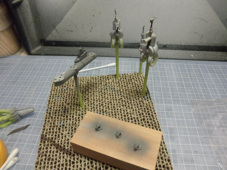 で、伊-400本体、晴嵐、飾り台(今まで書いてませんでしたが、船体を置くパーツは黒く塗装しておきます)に吹いてよーーーく乾燥させて、