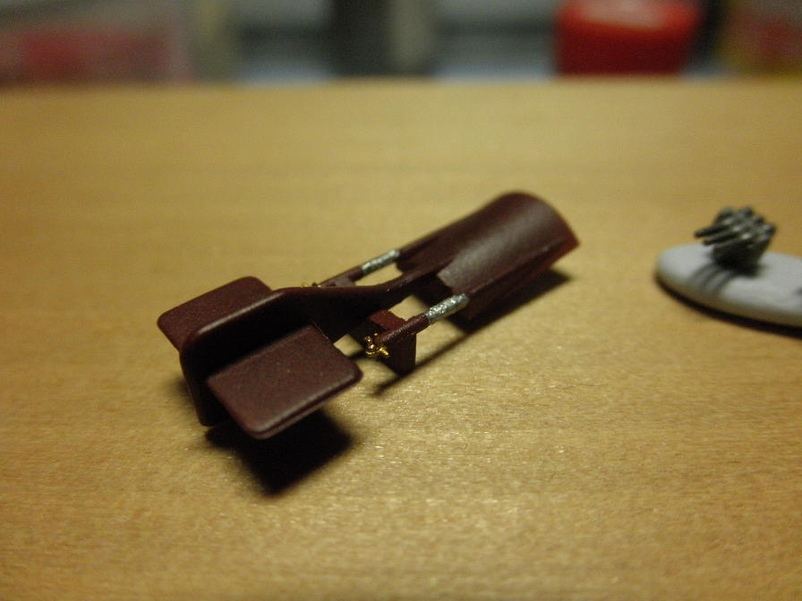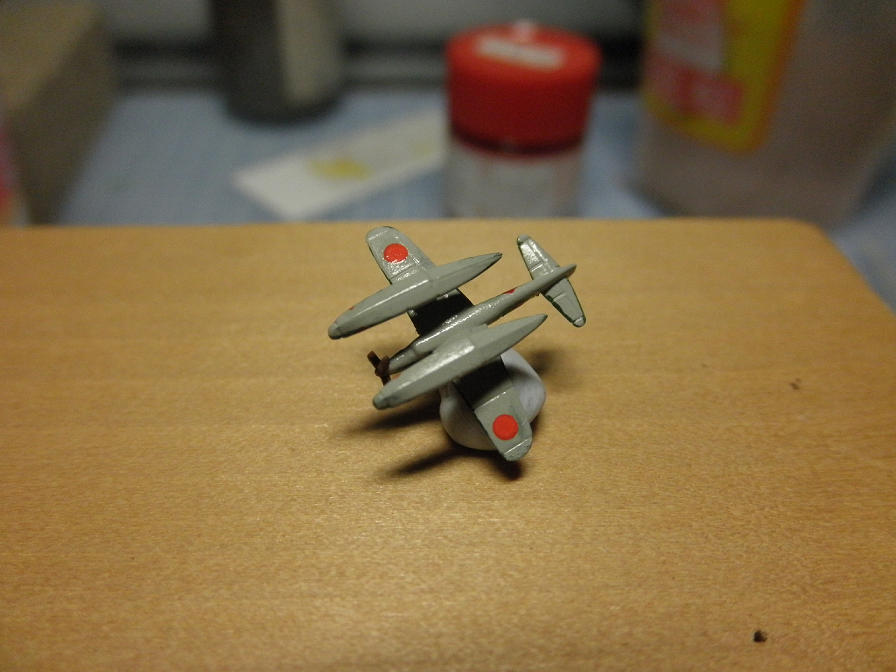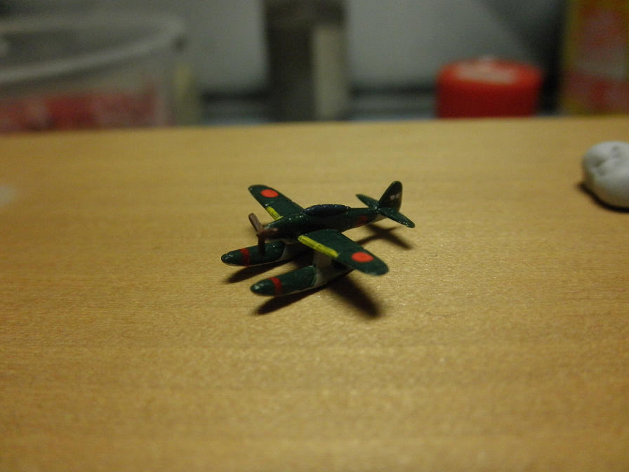最初に明灰白色をエアブラシで吹いて(細かい上に小さいので、厚吹きかつ吹き残しの無いように注意!!)、あとは筆で緑やら茶色やらを塗っていきます。胴体の日の丸とフロートの赤帯ですが、デカールで用意されていますが、ここでは塗装でやってしまいました(理由は後述)。塗装説明では、主翼前端の黄色が無視されていますが、実機ではちゃんと塗り分けられていたようなので、(いいアクセントにもなるから)忘れずに塗っておきましょう。