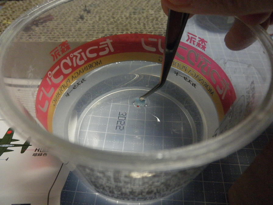 切り出したら、水の中に数十秒突っ込みます。これはデカールにより千差万別なのですが、あまり長く漬けておくと、糊がすっかり流れ落ちてしまうので、長くても、漬けておくのは30秒くらいに留めておきます。
