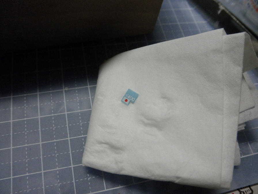 水に漬けたデカールを、上の写真のように、ティッシュなどの水を吸うものの上に置いておいて、余分な水気を切ると同時に、水をよく染み込ませて、糊を溶かしてしまいます。