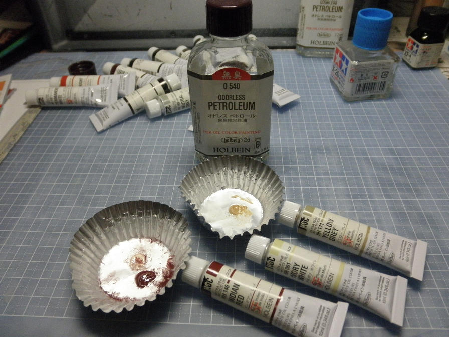 油絵の具と言うのは、もともと透明度の高い絵の具なので(おまけに乾燥も時間がかかる)色が乗りづらいのですが、それ故に、微妙な調子が簡単に付けられたりもします。また、エナメル塗料でのドライブラシは、下手すると塗面がすぐガサガサになりやすいのですが、油彩の場合は、その危険も殆どありません。