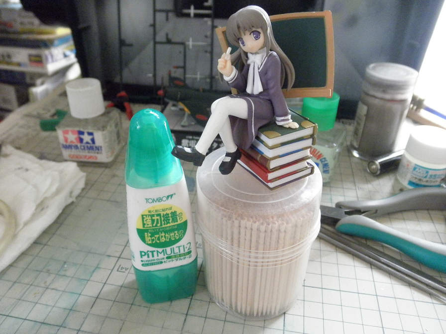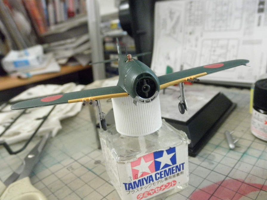 ちなみに、主脚が完全に接着されるまでの間は、主脚が直接接地しないよう、接着剤の蓋か何かの上に置いておくことをお勧めします。こんな具合↓↓↓。