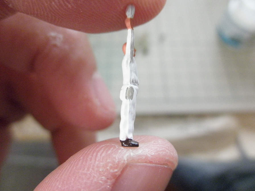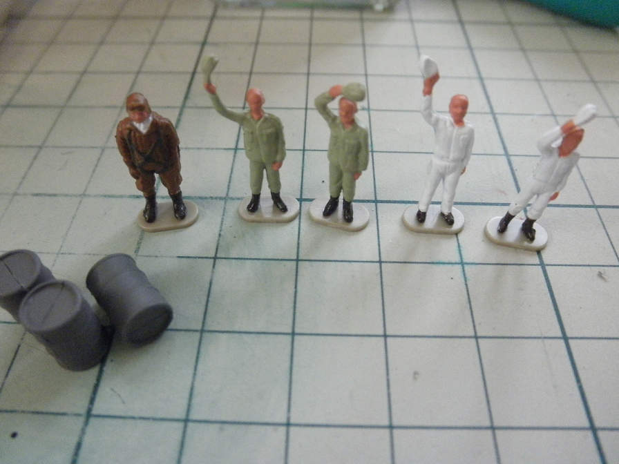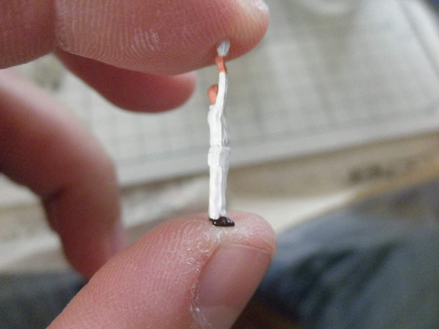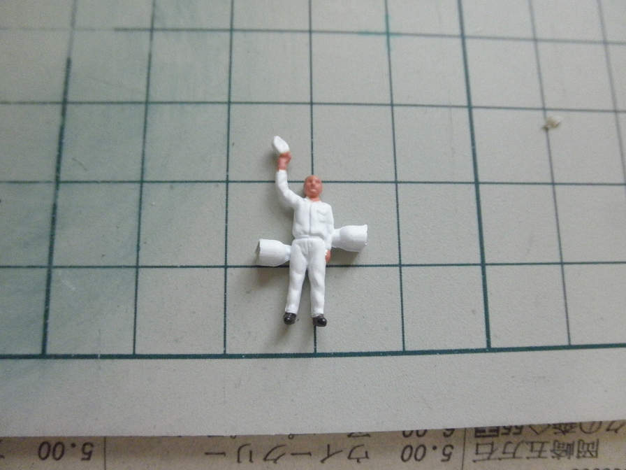 タッチアップ完了。切り出し後が分からなくなりました。このキットでは、白服とパイロットにタッチアップが必要になります。パイロットの方は、タミヤアクリルの”NATOブラウン”を使用しました。このような小さい面積なら、色がぴったり一致してなくても、大体で似通っていれば大丈夫です。ちなみに、緑色の服は、地の色と服の色が似通っているので、切り出しっぱなしでも見苦しくありません。