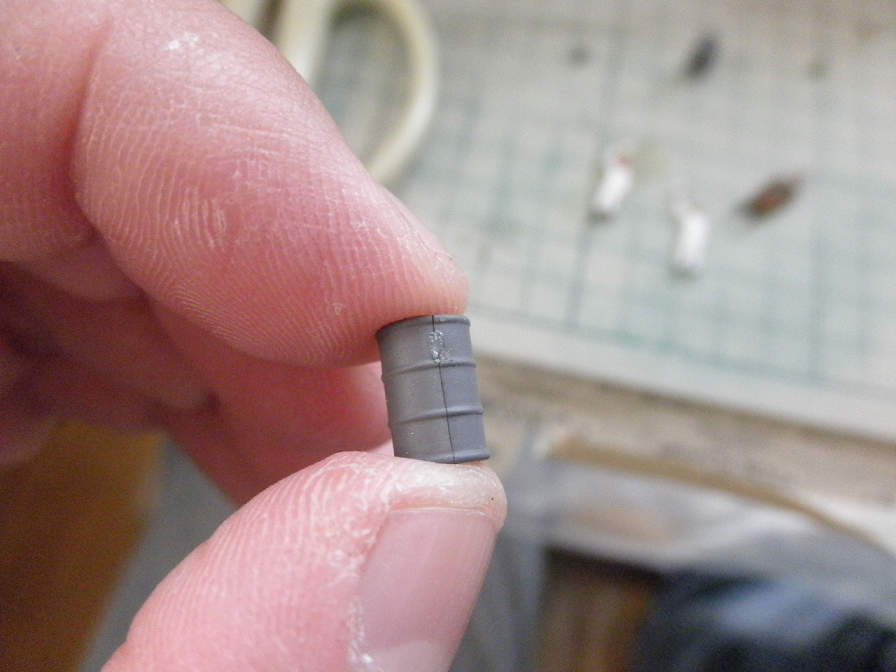 ドラム缶も、基本は一緒です。このように、切り出し後が一致するようになっているので、このようにパーツを合わせて接着し、ゲート跡をタッチアップします。タッチアップは、タミヤアクリルの”ニュートラルグレイ”でタッチアップしました。