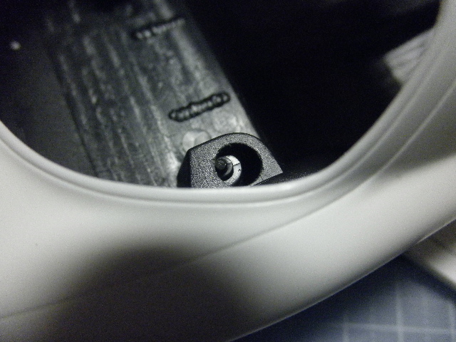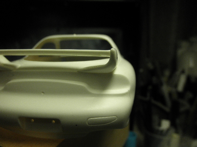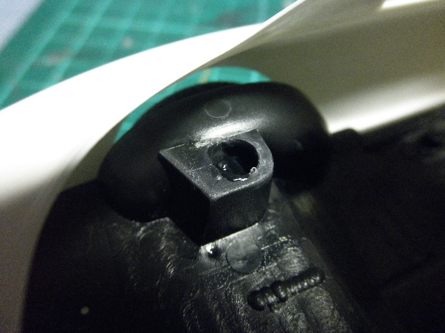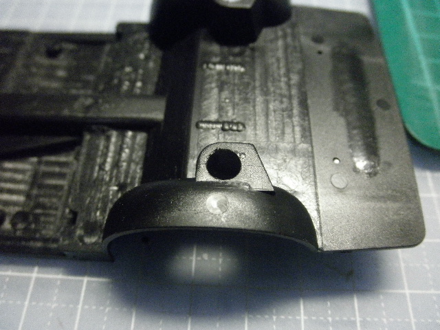 あと、ウィング基部の裏側(車体取り付け部ですね)も丁寧に処理しておきましょう。ヒケのほかに、きわどいところに押し出しピン跡らしい丸いくぼみがあるので、これはしっかりと埋めておきます。