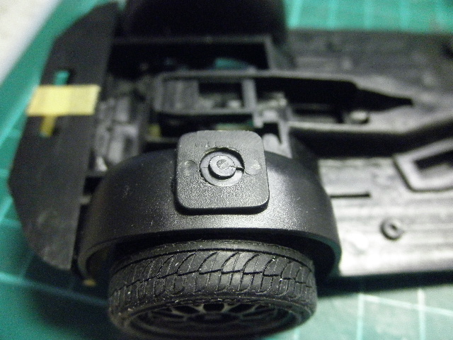 ここまでの工作で、車高が1mm低くなった勘定になりますが、ここで一旦ボディを被せてみて、タイヤの納まり具合も見てみます。