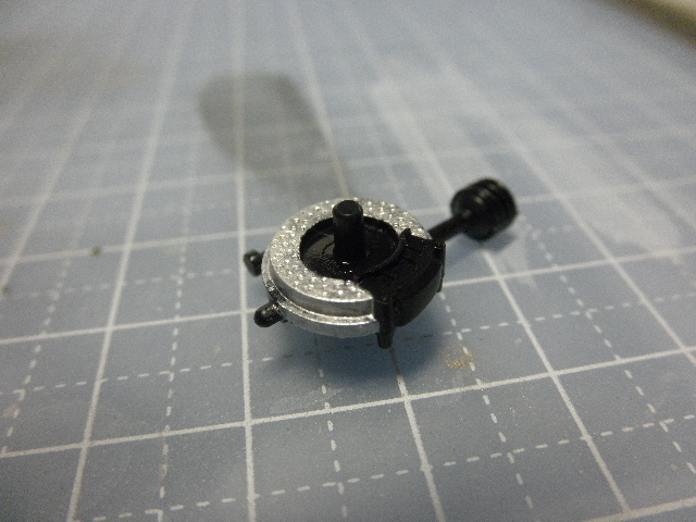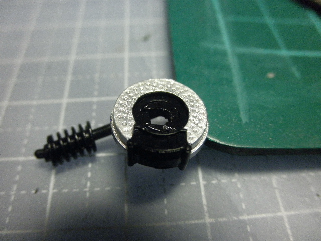 ファレホのシルバーを筆塗りして、後からクリアーでコートしています。塗りが汚くなってしまいましたが、どうせホイール越しでしか見えないので、筆ムラとかは殆ど気になりません。因みに、塗ったのはディスク部分だけ。ほかの部分はフラットブラックの塗装指定なので、無塗装で済ませてしまいます。また、作品は”ひっくり返す”ことを前提としていないので(笑)、ディスク裏面は全く塗装していません。