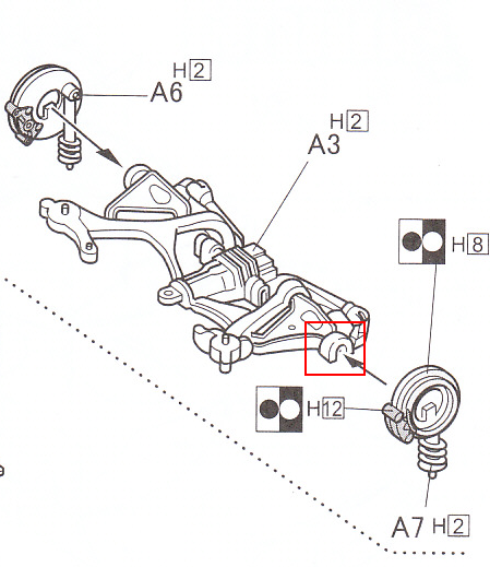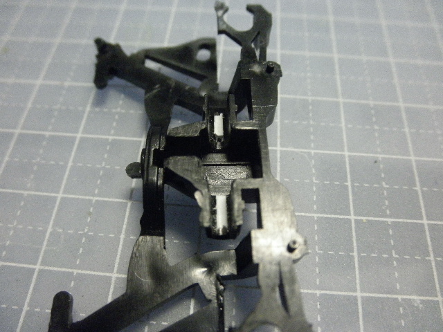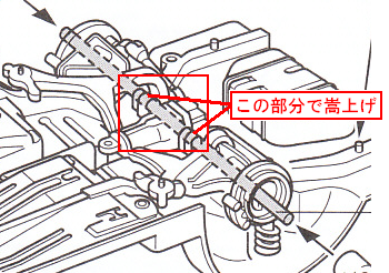サスペンションのパーツにはスプリングのモールドがありますが、このスプリング部分がシャーシに直接はまるようにして、車高を低くするようにします。左右のサスペンションは、シャーシとパーツA2で挟み込まれる形になりますが、この改修で、A2とサスペンションが合わなくなるので、A2のサスペンション受け部も、その分嵩上げしてやります↓↓↓。