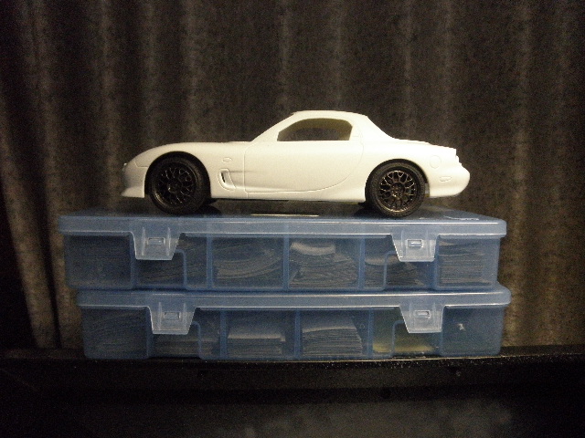 前後ともタイヤを取り付けたら(タイヤは接着が完全になってから取り付けます)、ボディをシャーシにかぶせて、ボディが変に傾いていないかをチェックします。