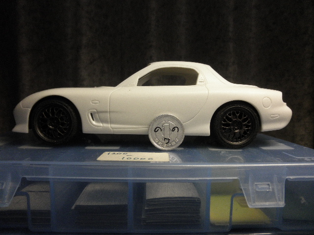 じつはこのキットを作る前に、知人のカーモデラー氏から、事前に「そのまま組むと車高が高くなるのでカッコ悪くなる」と制作上の注意点を受けています。コトブキヤのサイトの紹介ページを見ても、確かに若干腰高な感じを受けます。また、別の知人氏(この人もカーモデルをよく作る)より「フジミのカーモデル全般(最近作を除く)はデフォで足回りでドタバタする」とも言ってました。まあ、今回は目的が目的なので、ノータッチで済ませてもいい所なのですが、折角アドヴァイスを頂いたので、その辺をきっちり修正することとしましょう。