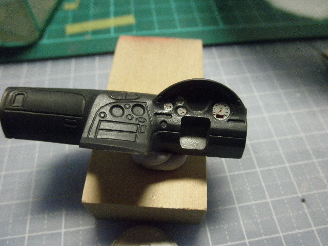 貼り終えたところ。しかし車体に貼るのに比べて小さいデカールなんですが、2枚も失敗してしまいました(爆発轟沈)。メータ一つに、中央のAV機器のパネル。それに良く見たら、貼れたうちの1枚は何かずれてるし。ああ、いっかな「内部は見せない」と言っても、これは流石に凹みます。しかし何で俺ってここまでデカール貼りが下手なんだろ…あううううう。