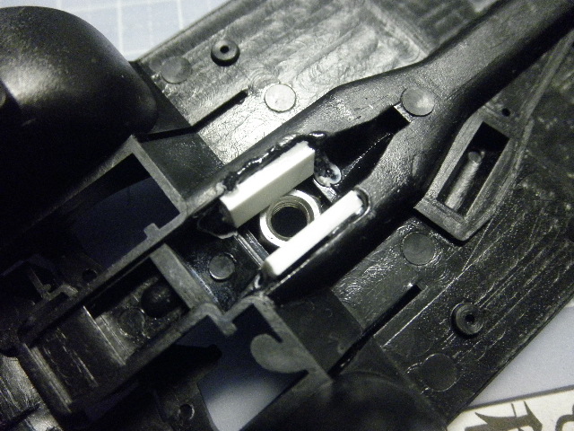 もしかしたら、工作のやりかたによって個体差が生じると思いますが、この場合は、上の写真のように、サスペンション上端を穴の縁につっかけることで、リアの位置がちょうど良い具合になりました。調整が終わったら、瞬着(ゼリー状瞬着を使いました)を流し込んで、一気に固めてしまいます。