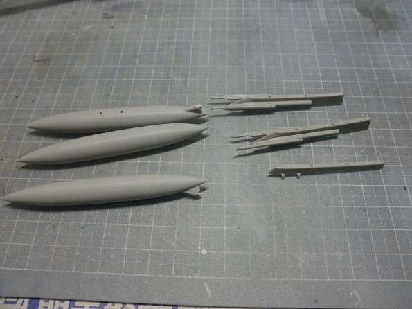 各パイロンと増槽が出来ました。写真に撮っていませんが、脚部パーツもパーティングラインの処理を終えています。増槽は、後部にリベット状のディティールがありますが、実機ではその部分に溶接ラインみたいな凸線が走っているようです。どのみち、合わせ目消しの邪魔になるので、そのリベットは綺麗に削っちゃってます。溶接ラインの再現は今のところ何も考えていませんが、何かしらの手当はしようと考えています。