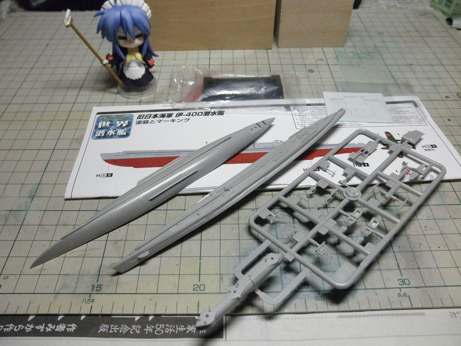 キット自体は、元々完成品(ディスプレイモデル)として売られていたものを、組み立てキットとして流通させたもののようです。完成品の値段がどの位するのか分かりませんが、このシリーズ、最近のキットとしては安い部類に入ります(¥1000)。ディティールは、元が完成品と言うこともあって、スライド金型を多用して、可能な限りディティールを盛り込んでいます。パーツ数も控えめ、接着剤を使うキットで塗装も必要ですが、総体的には「初心者向けキット」と言って構わないキットと言えるでしょう。潜水艦ってのは全体的に小型の艦形ですが、『伊-400』はそれでも大型の部類に入るし、知名度も抜群で塗装も単調じゃないから、その点でも初心者向けと言えると思います。
