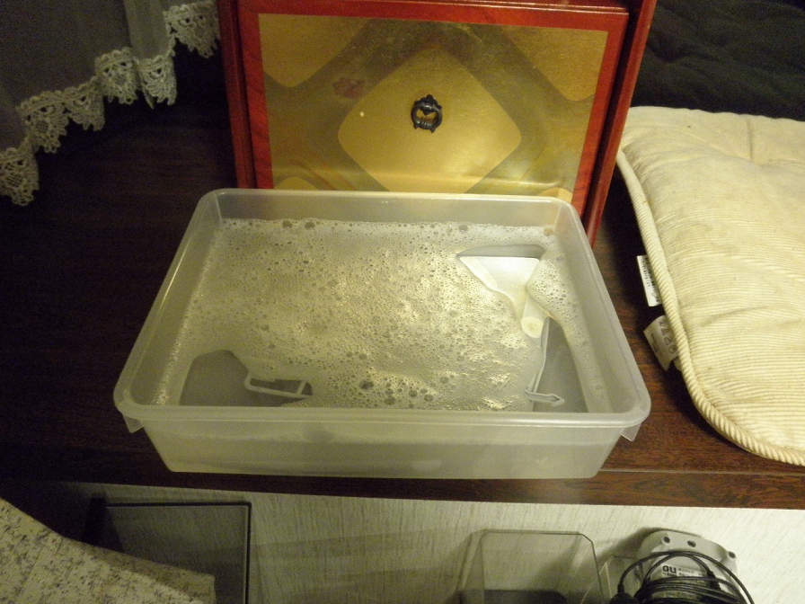 このように、中性洗剤(台所用ので充分)を適量混ぜた水を入れた適当な容器に、パーツを漬けておくだけです。とりあえず、半日~1日漬けておけば、大抵の場合は洗浄はOKです。漬けたあとは流水でキレイにパーツをきれいにすすいで水気を充分に拭っておきます。水気を切ったあと、陰干ししておくのも有効です。とにかく、すすいだ後の水気は、よく拭うか乾かすかしておきます。