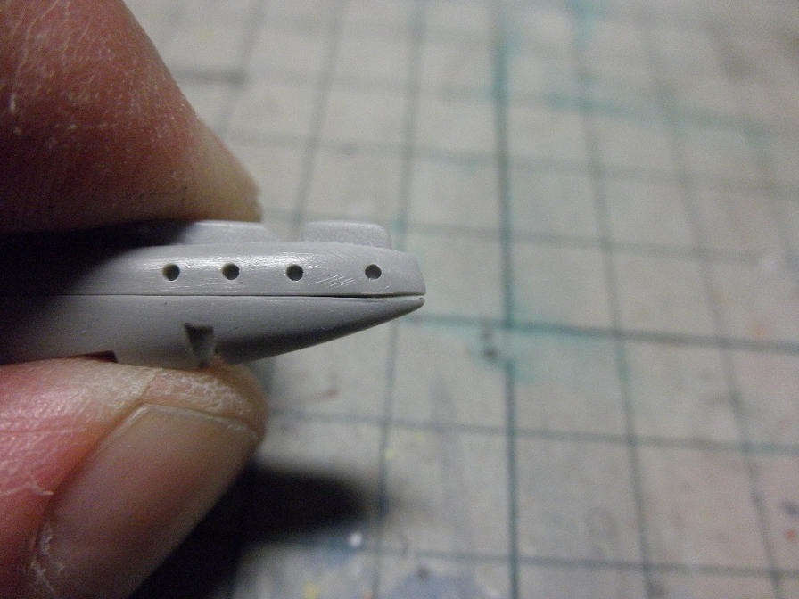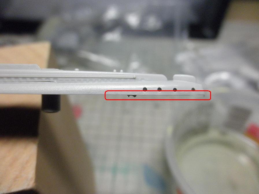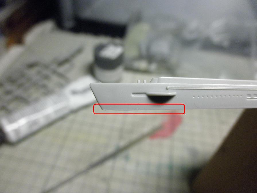 …と、その前に(何かこのパターン多いな)、船体パーツの接着面がちゃんと平らになっているか、チェックしましょう。このキットは、割と出来がいいと言っても、細かい部分の粗が目立ちます。ディティールには出ていないものの、その粗の殆どが接着面に現れています。例えば、下の写真のように。