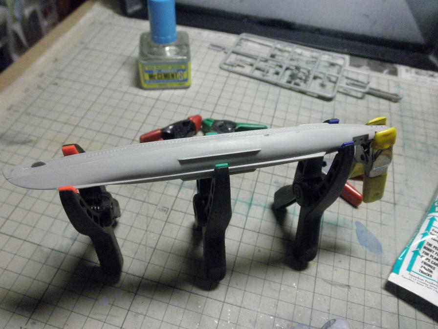 接着のやり方はいくつかあります。普通は、接着するパーツの両方(または片方)に接着剤をつけて接着する方法です。他には、今回のような長いパーツや大きいパーツを接着する場合、写真のように、クランプや洗濯バサミなどの強く挟む道具を使ってパーツ同士を固定して、パーツの合わせ目に流し込み接着剤を流す方法があります。また、接着したパーツ同士は、接着してしばらくはクランプや輪ゴムなどで圧力をかけて、接着がしっかり成されるようにするのも基本です(これはケースバイケースですが)。写真のクランプは、¥100均で買ったものです。このまましばらく放っておいて、接着剤が乾いた頃合でクランプを外します。