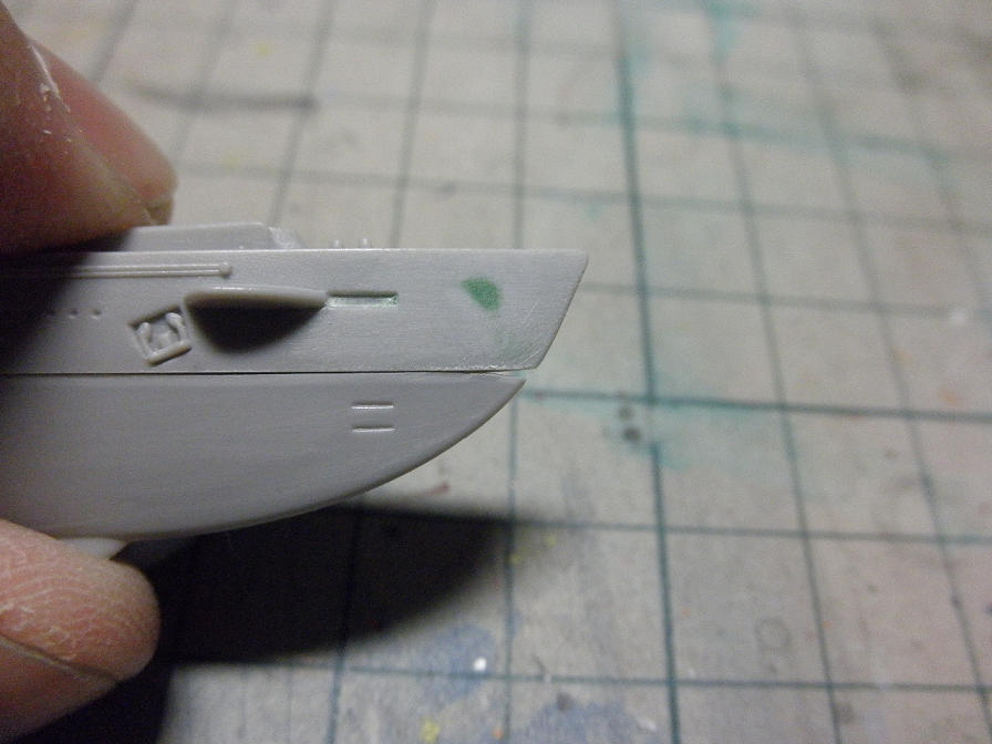 …これは接着前のヤスリがけが悪かったんでしょうね(苦笑)。艦首と艦尾に隙間が生じてしまいまいた。あと、合わせ目全周にわたって、小さいですが段差や隙間が目に付きます。モノが細長いだけあって、このような細かい隙間、段差は非常に目に付きます。