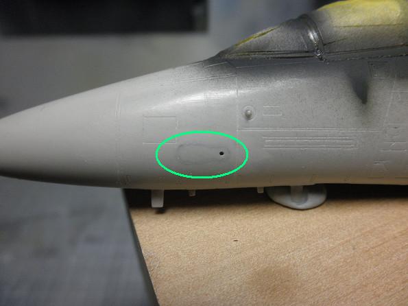 ちょっとしたところですが、機首のモールドで、緑色の丸で囲った部分のパネルラインですが、これは実機にはありません。これは『モデルアート』2012年12月号(※ハセガワ1/72ストライクイーグルのキットレビュー)でも触れられているところですが、これ、ピトー管の保護カバー跡(カバー形状に沿って付いた汚れ)をパネルラインと誤認したものだったりします。
