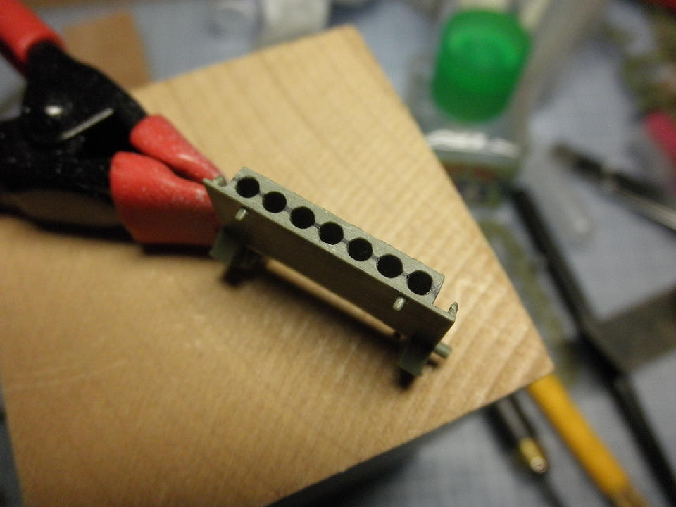 投射機のサイドには、庇みたいな出っ張りが付いているのですが、繊細なところに以ってきて、投射機のパーツの精度が甘いため、接着後の整形のとき、この庇がとにかく邪魔になります。まあ、本来なら注意しながら整形してやるのが一番なのですが、私は案の定(笑)気をつけたつもりがゴッッッソリと削り落としてしまったので(爆)、エヴァーグリーンのプラ材を使って、らしく作り直しました。