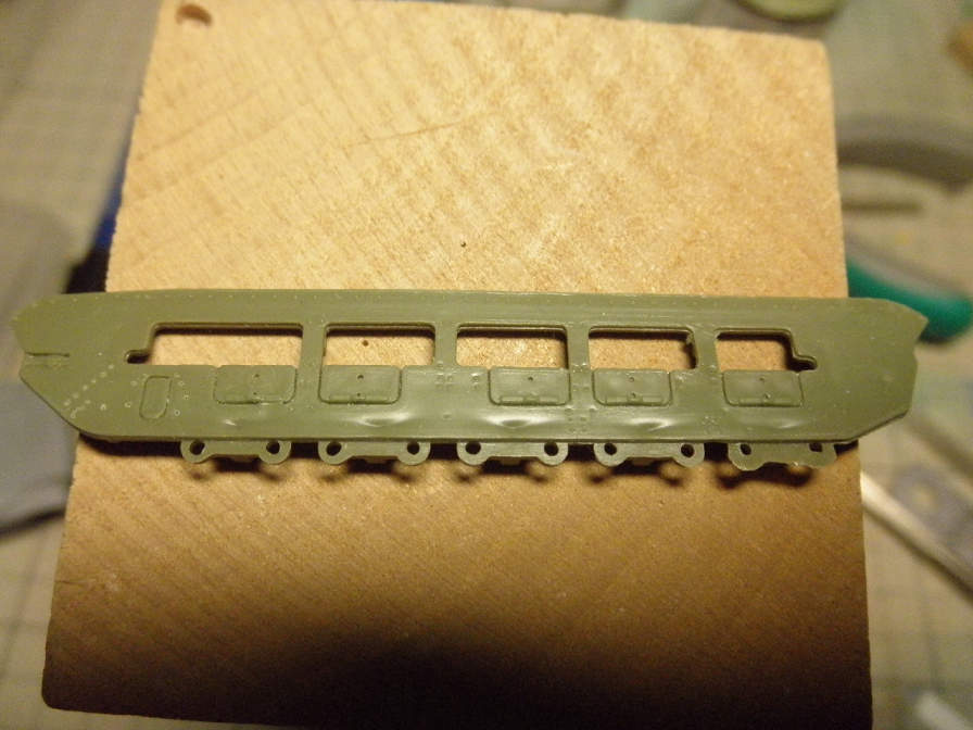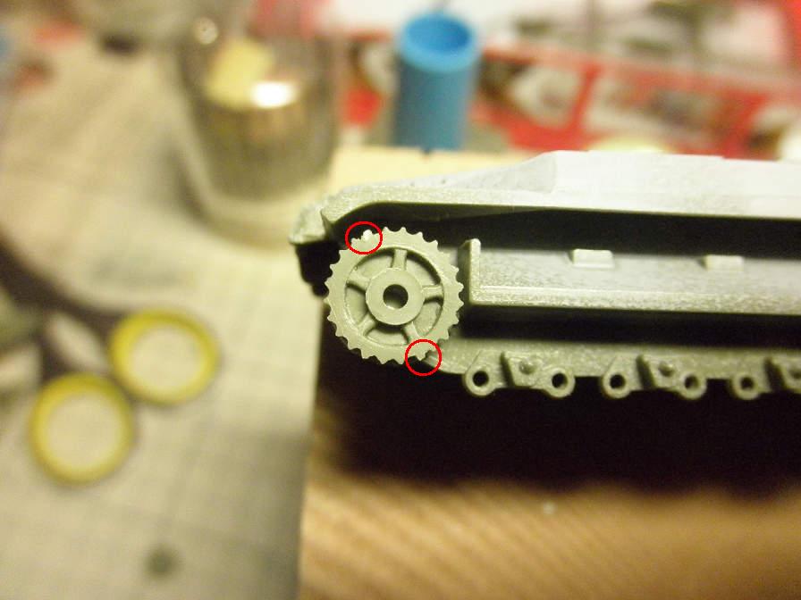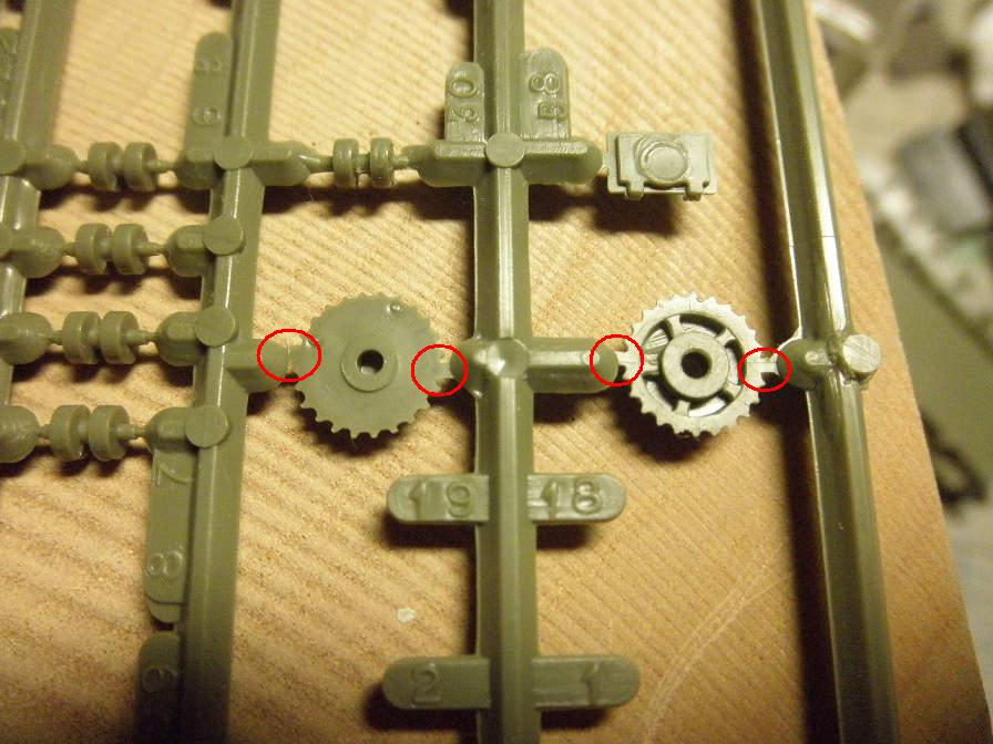 ごらんのように、本来、キャタピラにかみ合うはずの歯があるところに、ゲートががっつりと付いてたりします。当然、歯はゲートと一体化…と言うか、ゲートに飲み込まれてしまって、ありません(笑)。仕方ないので、ゲートを大きめに切って、ゲート跡を、それらしく歯の形にするしかありません…とは言っても。