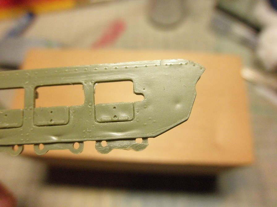 写真では分かりにくいかもしれませんが、リベットは、スケール相応としても、貧弱すぎるし、それに並び方が不均等になっているところもあります。それにリベットがあると、くっきりと出ているヒケの修正もやりにくいです。