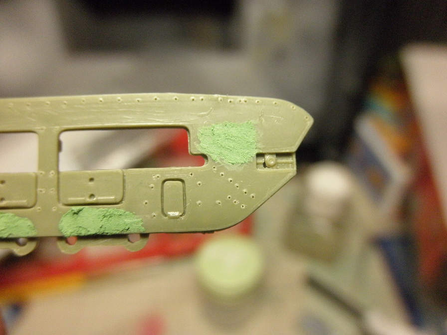 再び車体前部。赤丸で囲ったところには、ハッチのモールドがありますが、今後の合わせ目処理などで邪魔になることが確実なので、きれいに削ってしまいました。まあ、ここへは後でハッチの形に切り出した薄手のプラ板を貼ればいい、と言うこと。他、以前ケアした引けの対処も、まだ凹んでいるのが確認できたので、再びパテ盛りです。