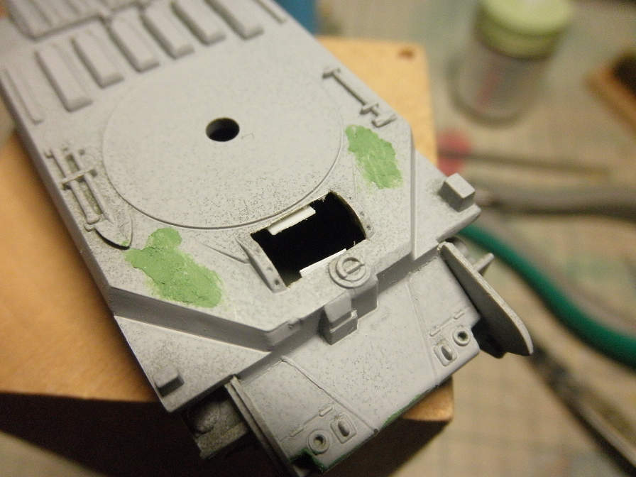まずは、テキトーなプラ板の切れ端で、車体内側にパーツ36を受ける”のりしろ”を設けます。で、まあ、これにハッチのパーツを付けるだけなんですが↓↓↓。
