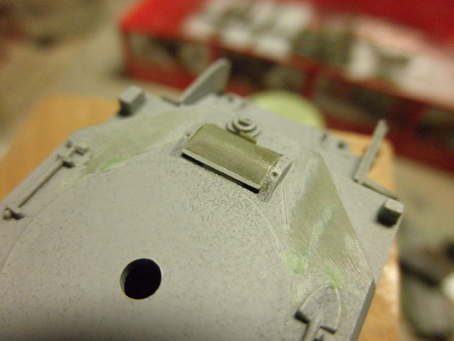 まあ、ブログにUpしていなくても、チマチマと工作は進めていたワケでして、車体を形にしてしまって、砲塔も着手してしまいました。とりあえず、表面チェックのためにサフェーサーを吹きました↓↓↓。