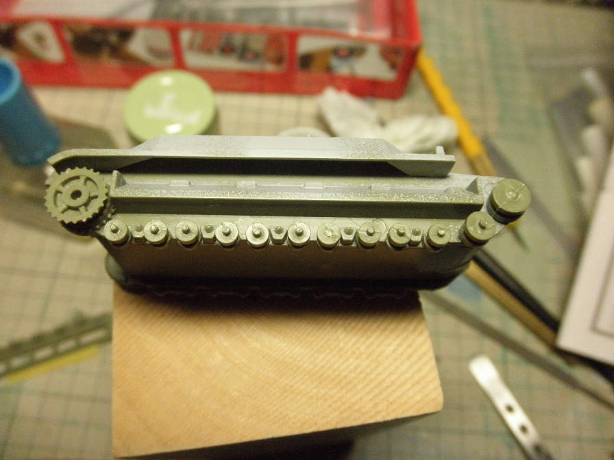 まあ、それはさておき(さておいて良いものなのか(爆))、ベルゲの最初の方でも書きましたが、私が戦車を作る目的と言うのは、とにかく塗装を鍛えるためであります。まずは3色迷彩を課題に課していたので、ドイツ戦車を作りましたが、迷彩のほうも、師匠に一応の合格を貰えたようなので、”単色塗装”を次なる課題に据えたのですが、ドイツ3色迷彩→パンツァーグレーorドゥンケルゲルブ、と言う流れは面白くなかった(個人的に)ので、積んでる中からソ連戦車かコイツか、の2択だったのですが、より作る人の少ない(一言余計だ)コイツを選択した、という事。